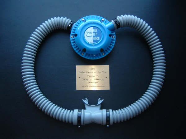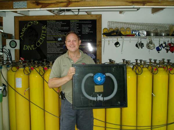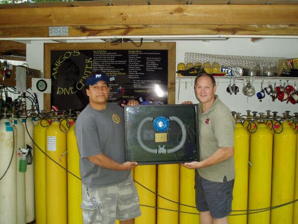 TheScubaMuseum.com from time to time takes note of Local Dive Shoppes (LDS) that provide exemplary service to not only divers, but vintage divers. Many plaques and certificates have been awarded but www.TheScubaMuseum.com decided in 2009 that one dive shoppe had outdone all the others. That shoppe was Amigos Dive Center in Ft White Florida. The owner of Amigos, Wayne Kinard not only provides banked mixed gases, but he has a self serve 24 hour fill station and is a Dive Rite and Trident dealer. Wayne has for years been very helpful and welcoming to vintage divers from all over the USA and other countries. This could be in part to the fact that he dived many of the springs and caves in Northern Florida before the days of the SPG and single hose. That is right Wayne is one of the original vintage double hose divers and can still be seen from time to time donning a twin hose with some of his NAVED buddies. So www.TheScubaMuseum.com presented Amigos and Wayne the first Annual Dive shoppe of the year award for 2009. To learn more about Wayne and Amigos please visit www.amigosdivecenter.com .