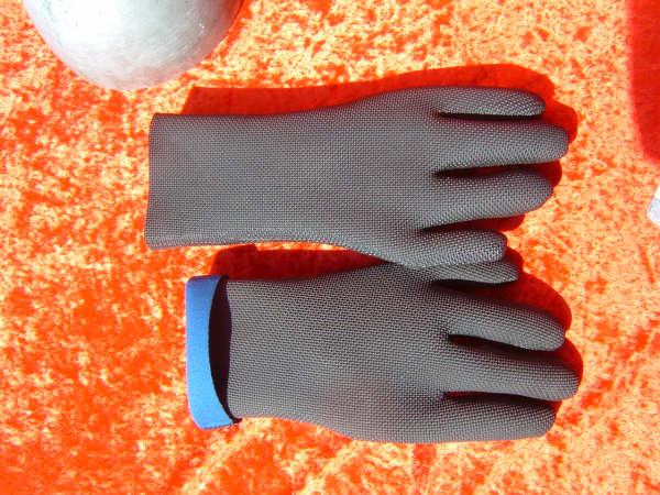 NOS shark skin gloves size LARGE. They are never used but old neoprene is likely to tear very easily after sitting around for 40 years. I cannot guarantee that they will hold up to the rigors of diving.