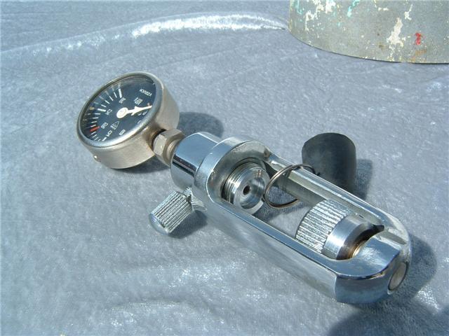 This is a brand new still in the wrapper, though torn open, Czech made tank checker. This pressure checker was the product of a Czech firm called Sportklimex Praha, later called Aquacentrum praha. This checker dates from about 1971 and is made of chrome plated brass. It was made in Prague (Praha) and has a yoke very reminiscent of a Healthways regulator yoke. It is very well built and attractive. Any information about this item is welcomed from our Czech friends.