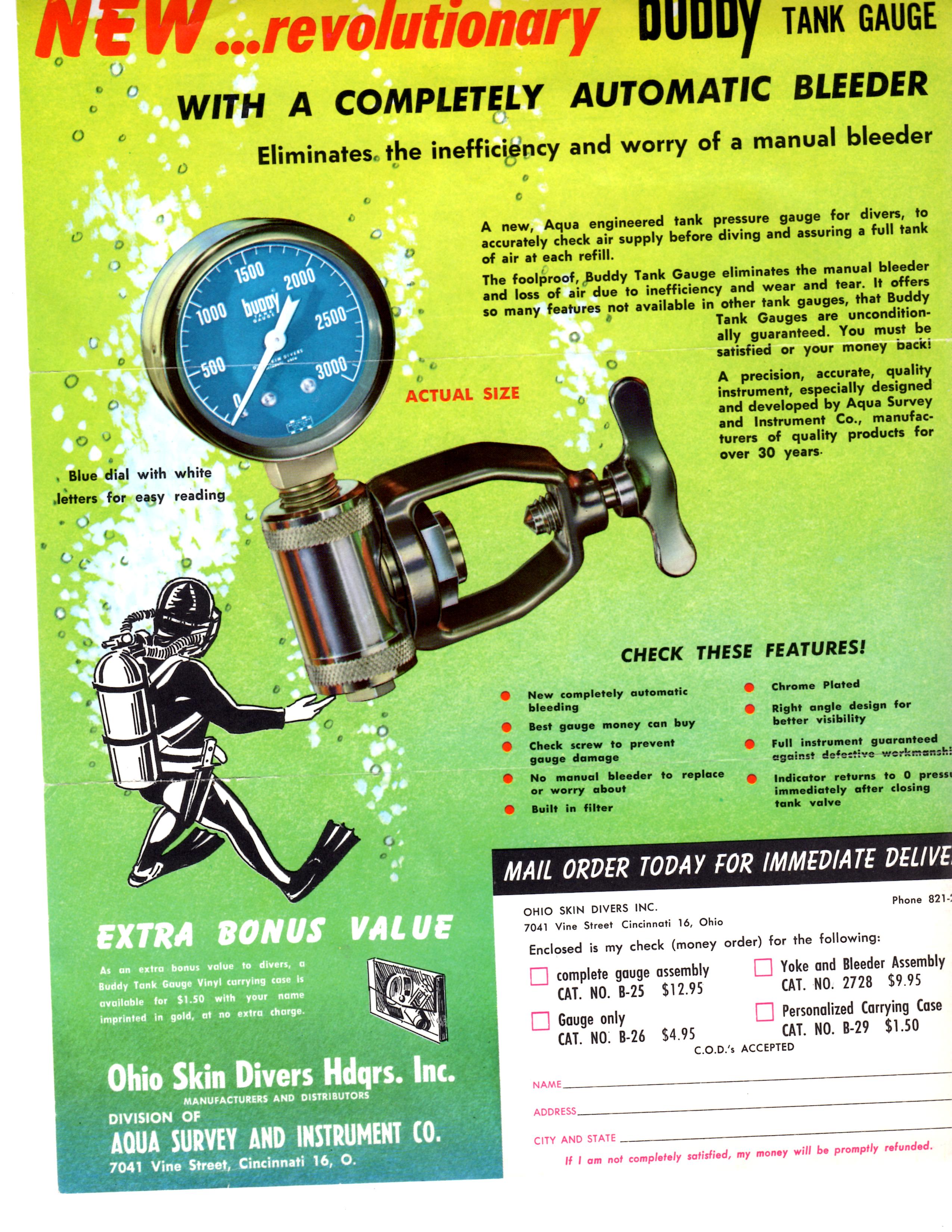 This tank checker was sold by Ohio Skin Divers Headquarter INC. located at 7041-43 Vine St in Cincinnati 16 Ohio. The address of course predates zone improvement plans (or zip codes) which started in 1963.