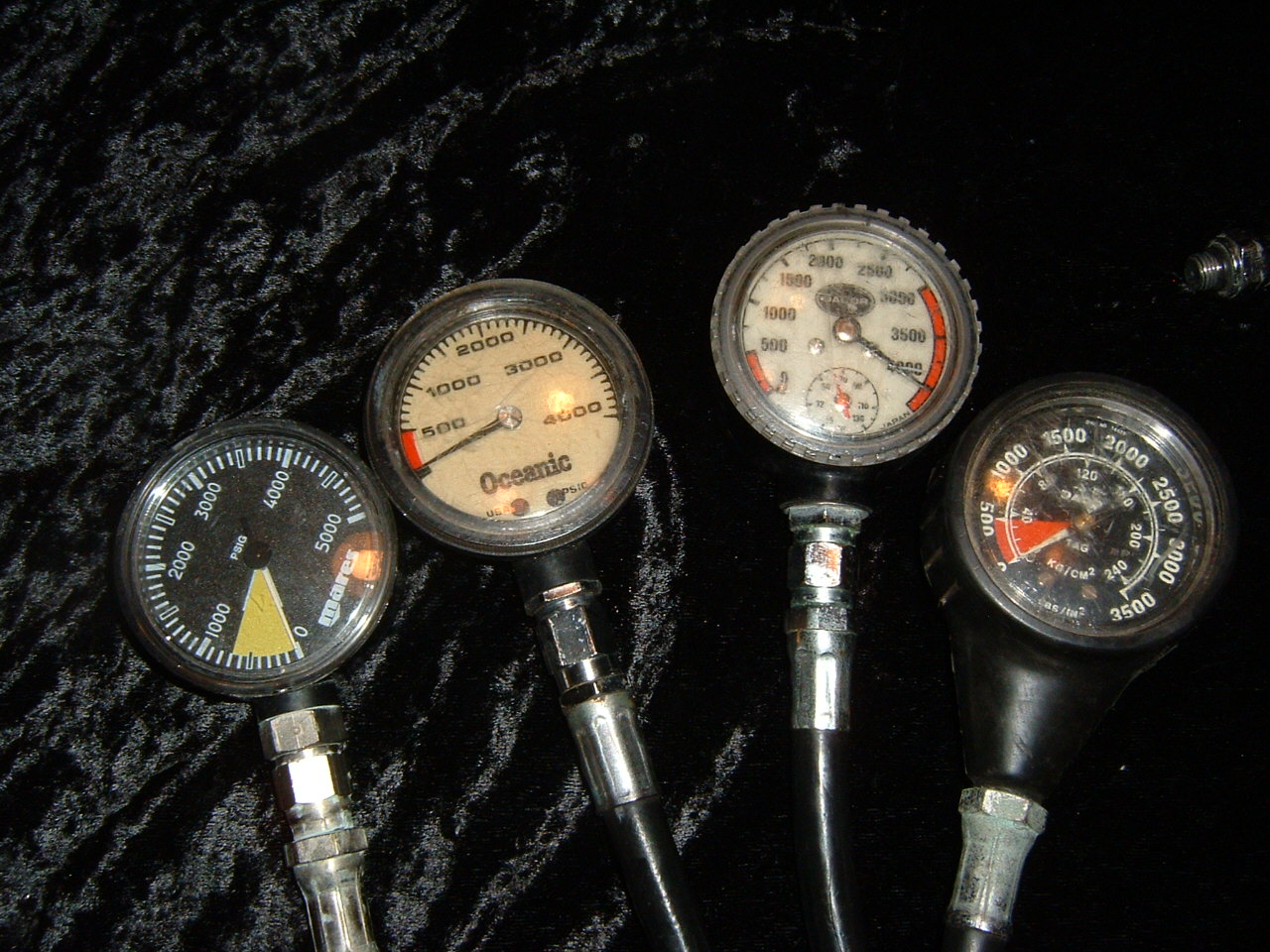 The Museum has a large variety of vintage used pressure gauges available. All gauges are tested before shipping, but please keep in mind that there is some varience expected. If you want this gauge to match exactly to your other gauge or your computer you may or may not be disappointed. If the gauges are within 200 PSI I certify them as good. If this does not meet your expectations lease do not buy. All gauges for sale on this page are old school brass and glass unless otherwise stated. All gauges come with the hoses as pictured and you will expect the hoses to be curved and possibly in need of being replaced. Some of the hoses are OEM. If the hose is obviously compromised I will state so.