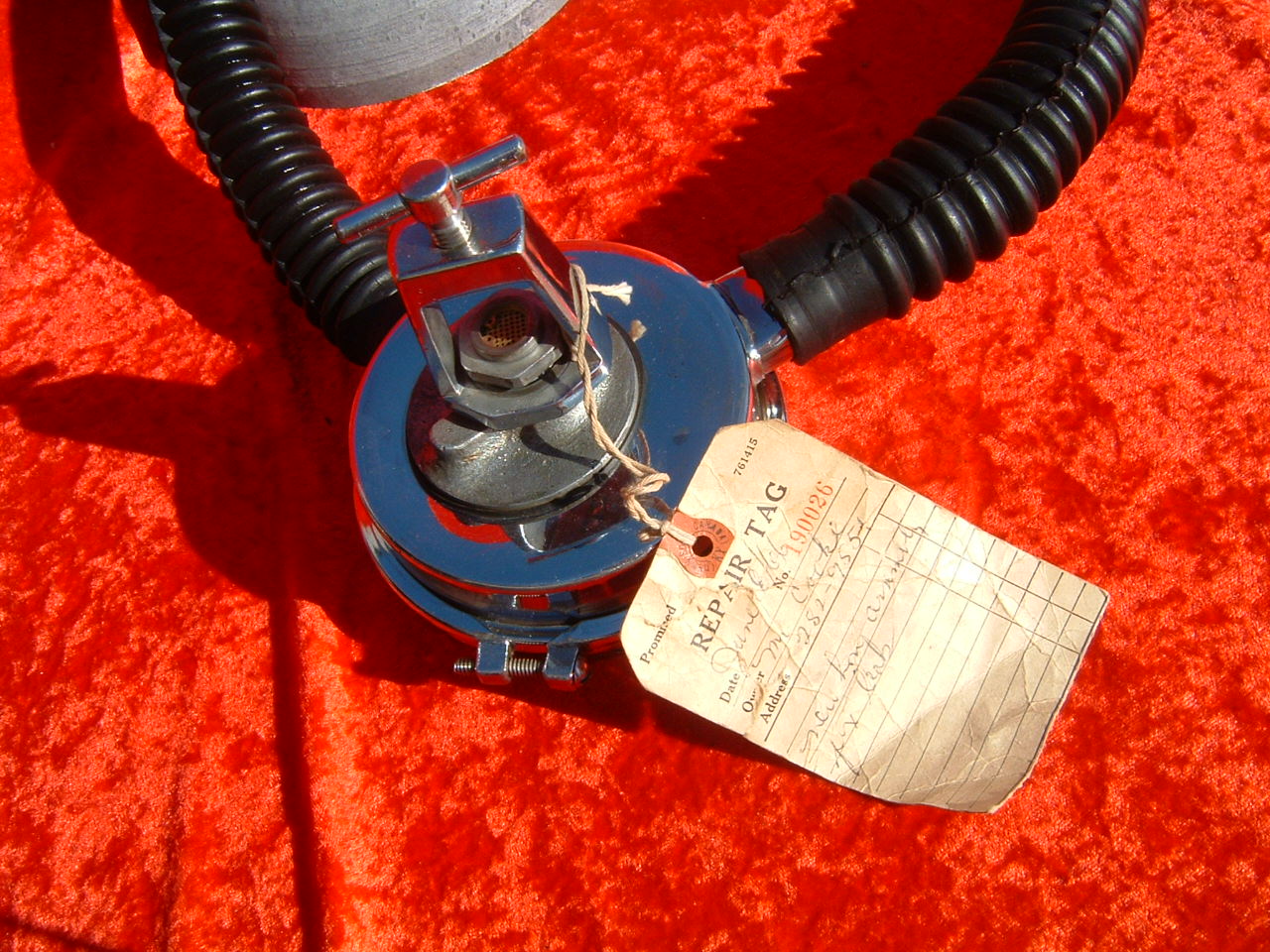 This International Divers two stage Navy Type was obtained by the museum in Ontario Canada. It came complete with the one piece hose assembly and a repair tag from August 1966. It listed a new hose assembly for $12.95, HP seat for $3.15, Horseshoe for $5.50, hinge pin 50 cents, and duck bill for $2.75 for a grand total of $29.85 after the $5.00 in labor was tacked on. Oh how things have changed. This regulator had no one way valves in the mouthpiece so one had to roll to clear it.