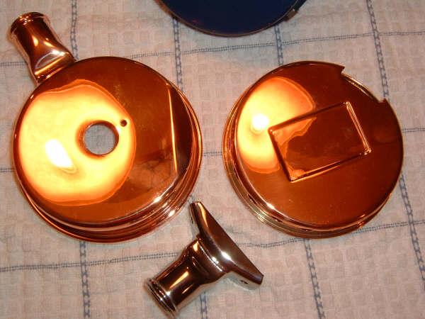 Below you can see the original Over Pressure cans stripped down to the bare brass and the rivet holes resealed. Next to the project regulator is an original JC Higgins used as a model. The paint job was done by Roger V., the rechrome work by Dave A., and the label by Jerry M.