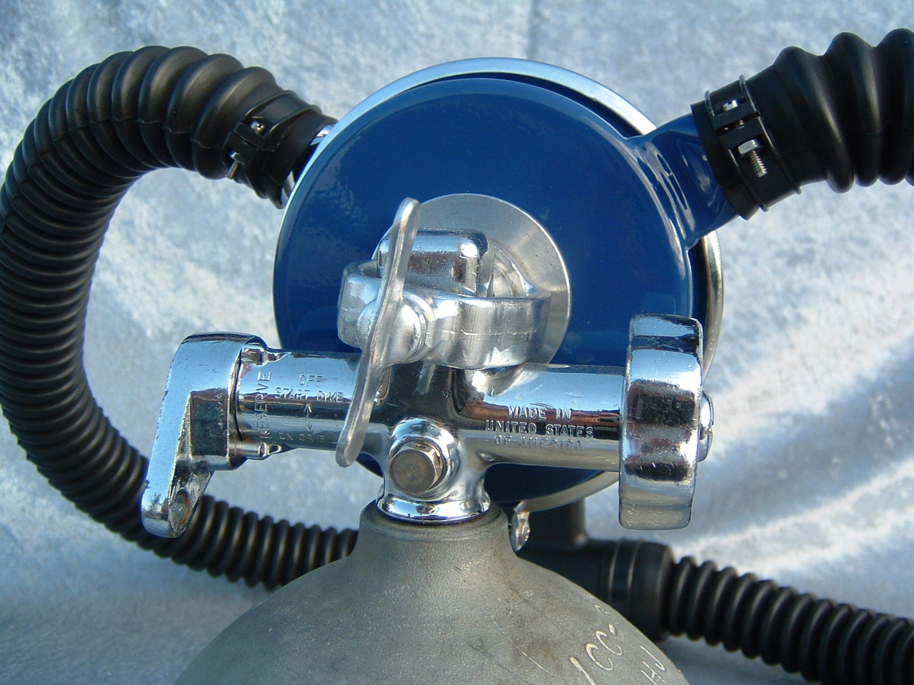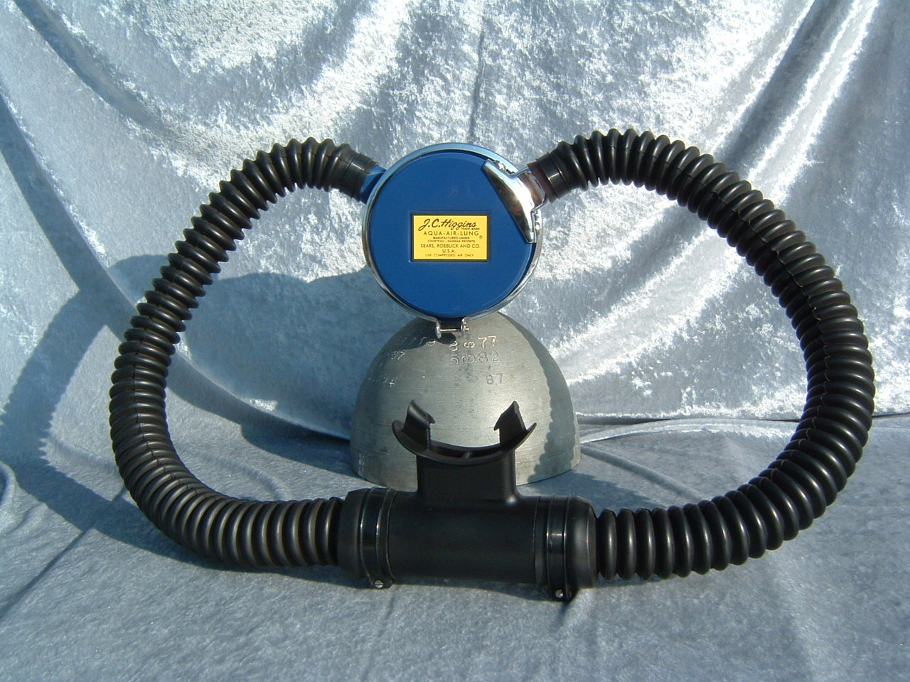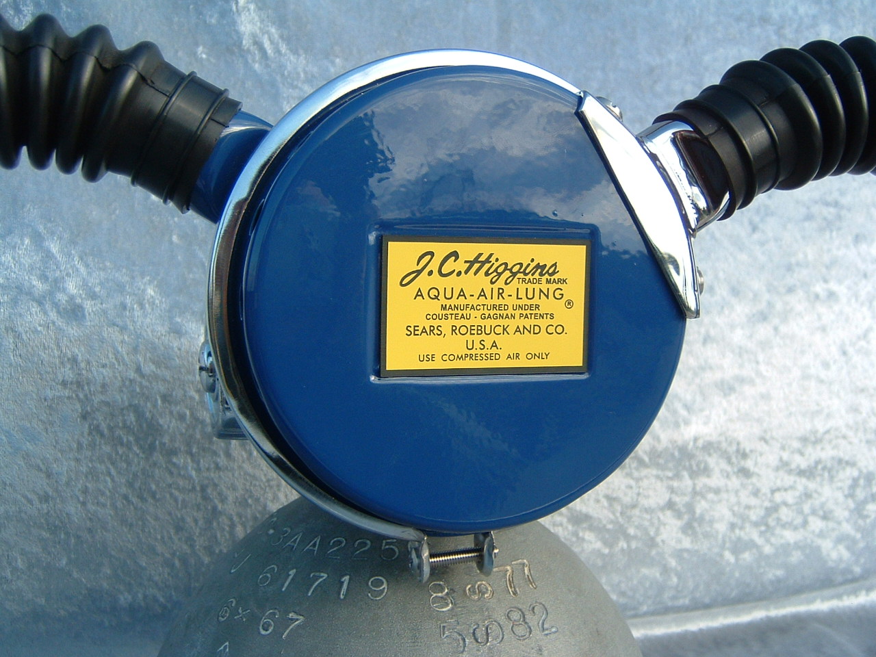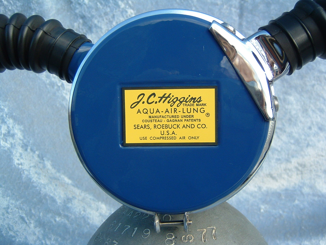 This Faux JC Higgins was made from an Over Pressure. The original regulator was made for Sears by Aqua Lung, and sold under the JC HIGGINS name. It was unique in that it used an early label side can with a separate exhaust housing like found on the early Aqua Lungs. This one was made from an Over Pressure. The label was fabricated, it is a decent reproduction, but not exact. The can paint colour match was made by the aid of an original JC Higgins regulator using a paint computer.