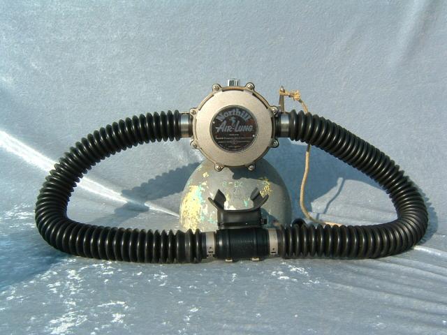 The Northill Air-lung was made of brass and weighs a substantial amount. It was made by the Garrett Corp in the good old USA. The mouthpiece was a DSV, see the dive and surface mode. The regulator also has a built in reserve mechanism which was great in the days of the old post valves.