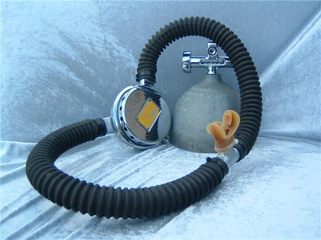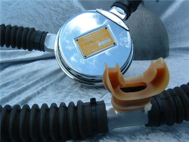 This is the Overpressure completely restored and rebuilt by Vintage double Hose. This regulator cannot be over breathed and in fact darn near will give you an over expansion injury in the garage! After having it restored I can see why it did not last in it's original configuration long with most divers. Also included in these pictures are the original riveted diaphragm, now quite crunchy, and the original green supply hose. The original US Divers marked corrugated hoses are still in great shape even after all these years. This regulator was a favorite of Poppy Lungmeister acording to Bryan of VDH!