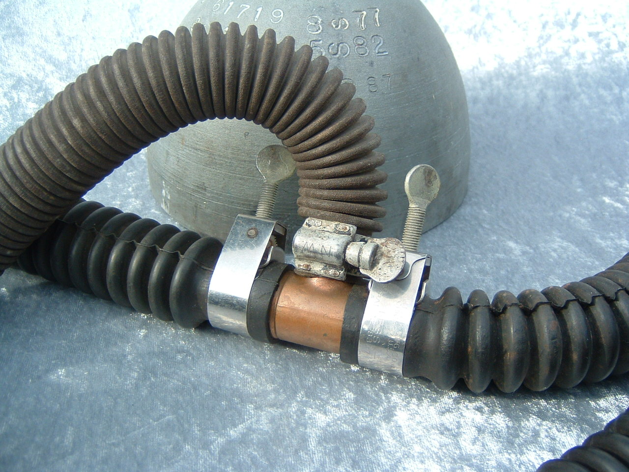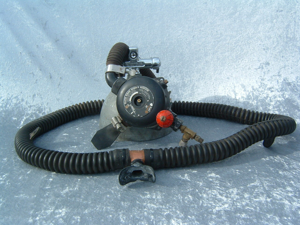 This is a fantastic example of a homemade regulator from the 1950's. It was most likely made using the July 1953 Popular Mechanics article and a WWII oxygen aviation regulator. The regulator's diaphragm have to be "waterproofed" before using it as an underwater regulator. I have not dived this regulator, but the few old timers that I do know that have all said it was a very hard breather. I acquired this regulator in the Ocala area and I do not know who made it or the history of it. If you happen to know the maker and or the history please contact me.
