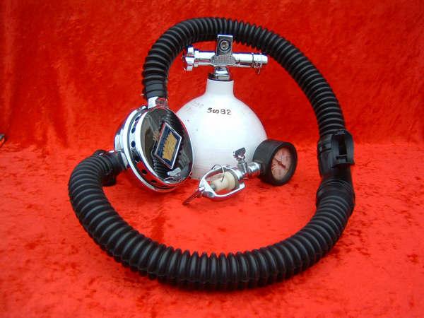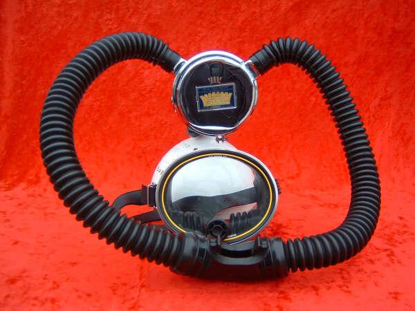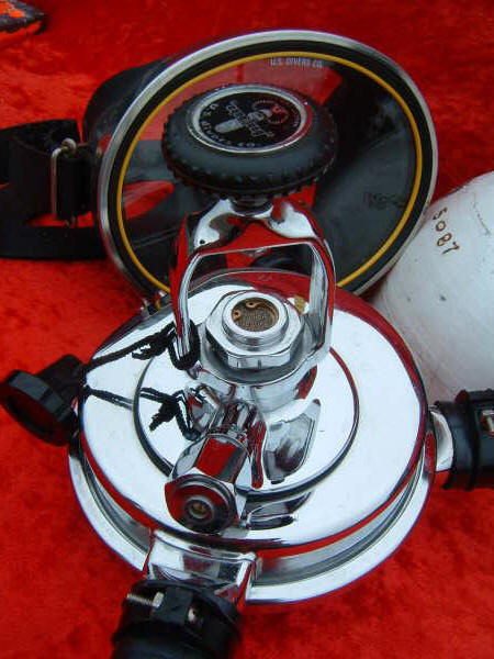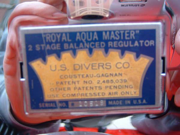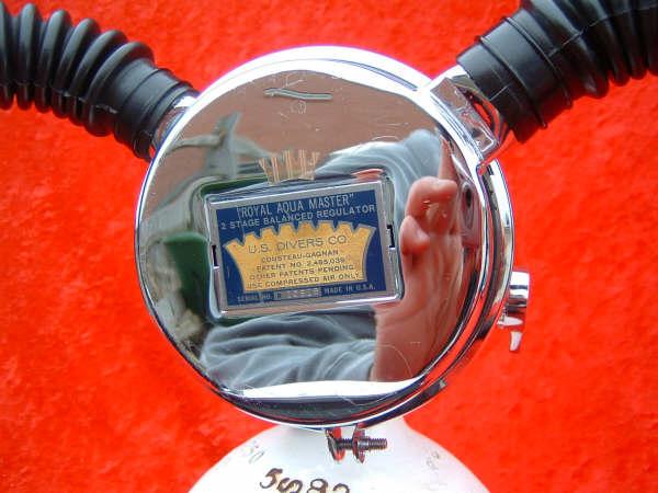 The ROYAL AQUAMASTER, AKA the RAM! This is the best breathing regulator that US Divers had to offer. If you want a vintage scuba regulator that will breathe well on a high pressure cylinder then this is the one you want. It does not matter if it is at 3500 PSI or 300 PSI, it will supply you air like no other regulator out there. This example came to me with mismatched hoses? One hose appeared to be of DACOR DIVING LUNG origin and the other a regular US Divers, The regulator itself looked as if it had been dived, if at all, a few times in fresh water only. The label is a gorgeous blue and almost perfect. The chrome also is so nice it was a pain to photograph. I bet you can tell me what kind of camera I was using (see reflection). I restored this regulator with correct US DIVERS hoses and dive it with great care.