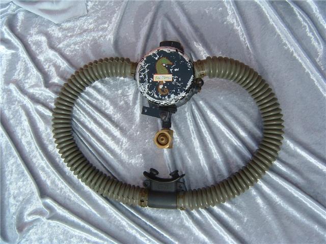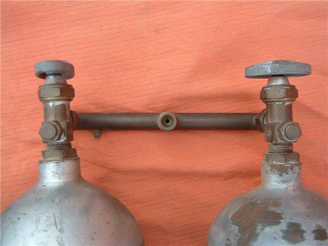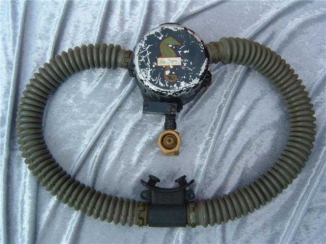 This Seahorse regulator and tank combo dates from the 50s. It is very similar to some of the homemade rigs made by early divers using Oxygen diluter regulators from WWII aircraft. This diving setup was sold out of Pittsburgh Pa. in the 1950s and was not very elegant. The tanks on this specimen were last hydroed in 1967. The company apparently took the surplus oxygen regulator and waterproofed the diaphragm, added a Seahorse logo and mounted it to a solid manifold and sold it as a diving rig. I do not know anyone personally that has dived one of these, but perhaps with the aid of some friends and a new harness from the Allan custom harness works I will some day.