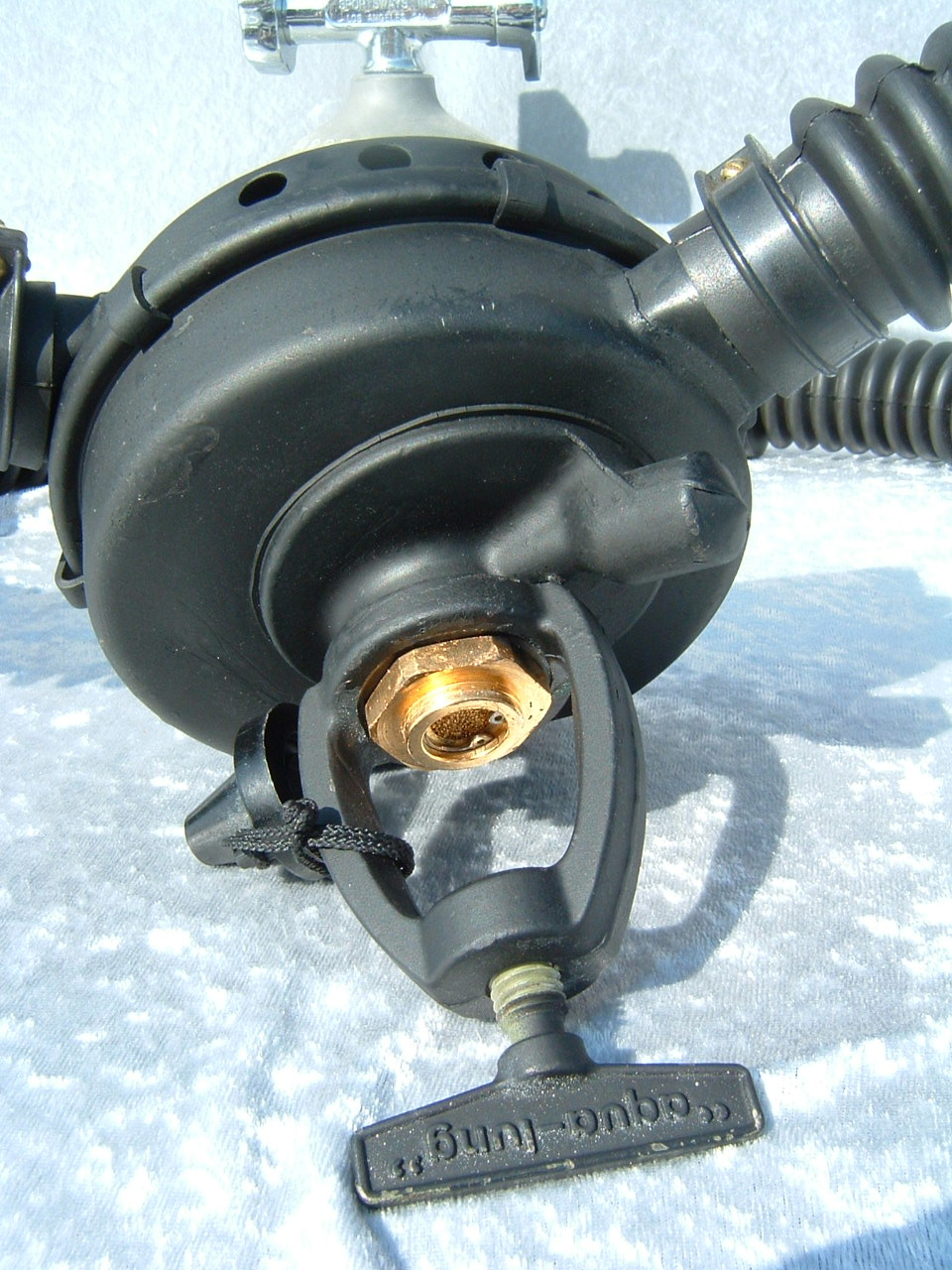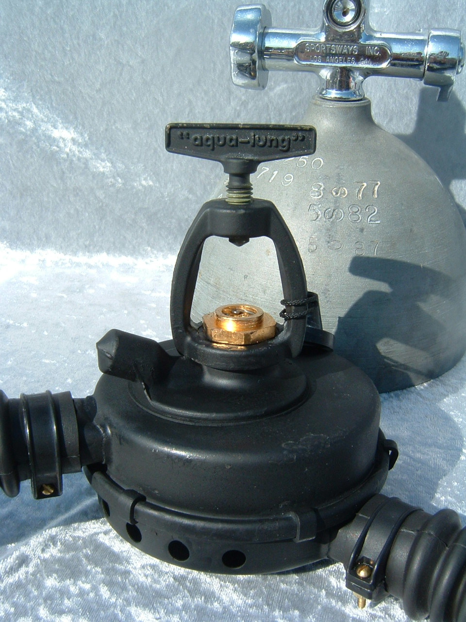 This NON MAGNETIC does not actually have low MU markings and is composed of non magnetic parts that failed the military's signature testing. These are very easily identified by the unique foil style label US Divers placed on them as well as the heavy yoke with small yoke screw. It is reported that approximately 90% of the non mags submitted to the US Military failed the test and did not receive the low MU marking. Some of these regulators still went into the service of the country for missions that did not require a low magnetic signature and were used in various "tactical" missions. This model is serial number 1721, however I do know of one other in a private collection serial number 2018 indicating that perhaps over 2000 tactical non magnetic regulators were made by US Divers.